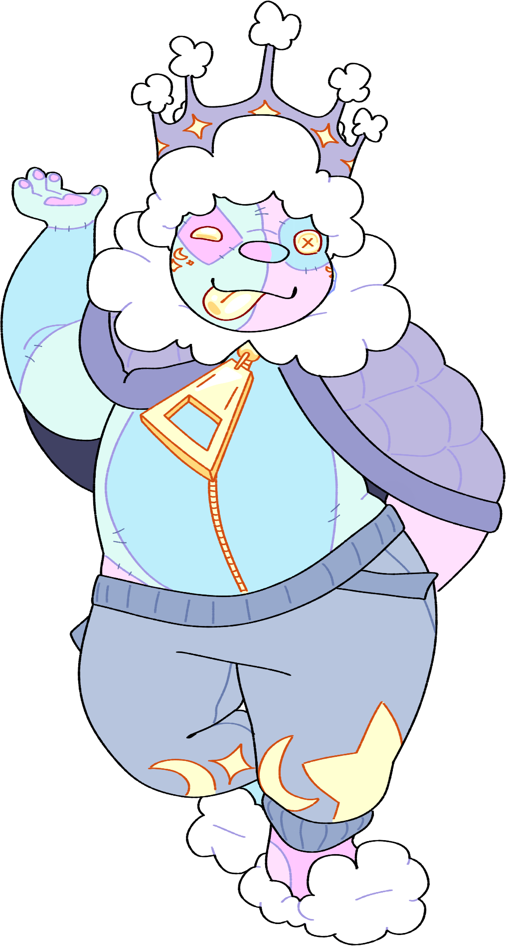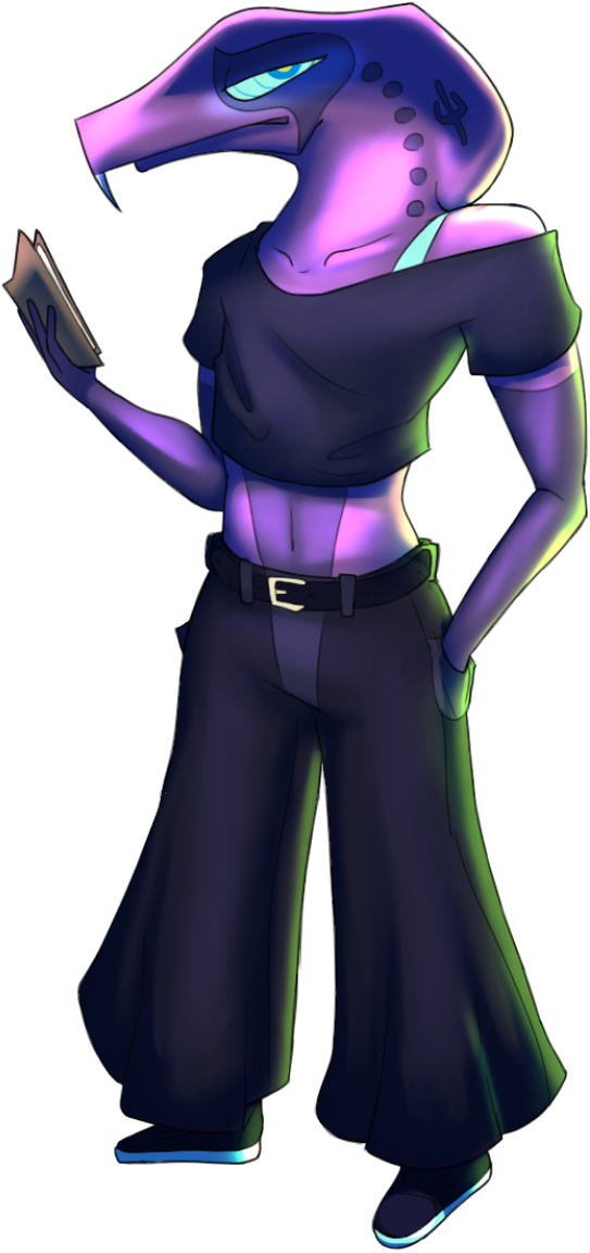 Oslo is a desaturated purple snake with a wide hood. He has a long snout with four pointy teeth. His eyes are a bright glowing cyan, with green pupils. Around his eyes is a dark indigo marking, with six dots running down the sides of his neck. A dark indigo coloration runs up his arms and legs, creating the illusion of sleeves and socks. Oslo is also very skinny and lacks a tail.Oslo often likes to wear baggy or lazy clothing, never putting too much effort into his looks.